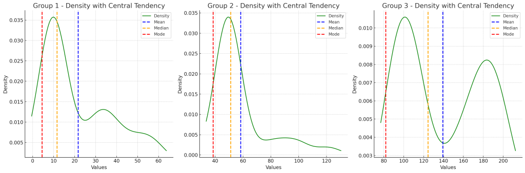 - 중심위치의 측도: 각기 다른 세 그룹의 데이터 분포를 시각적으로 나타내며, 평균(Mean), 중앙값(Median), 최빈값(Mode)의 차이를 강조한 것이다. 각 그룹은 서로 다른 비대칭 분포와 이상치를 포함하여, 각 중심위치 측도가 명확히 구분되도록 되어있다.