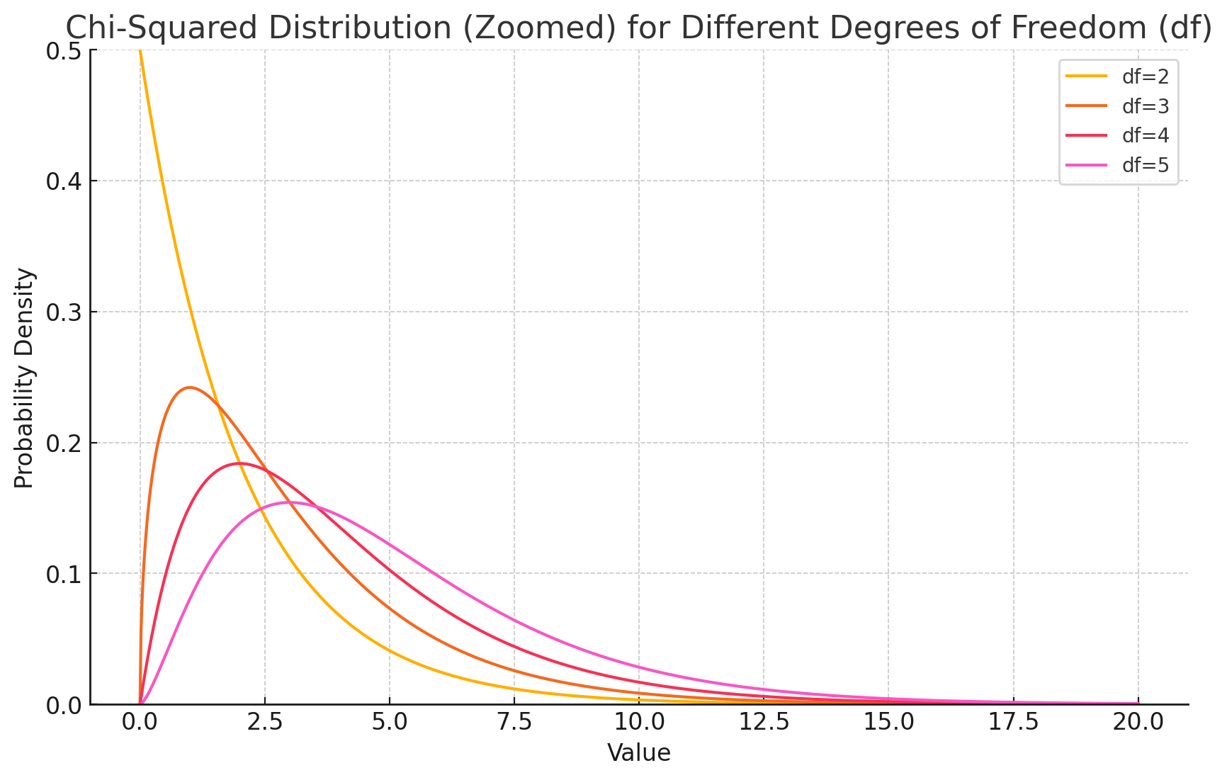 위 이미지는 카이제곱 분포의 다양한 자유도(degree of freedom, df)에 따른 분포 곡선을 나타낸다. 자유도가 2,3,4,5인 경우 각각의 분포가 어떻게 변하는지 보여주고 있다.