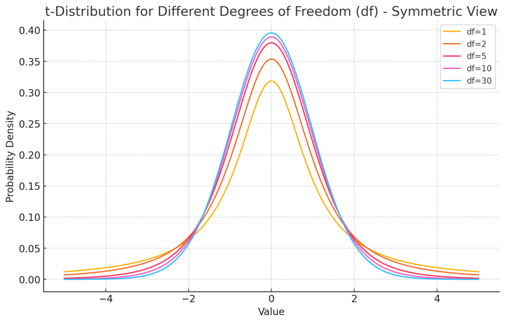 - 자유도 5 (df=5): 분포가 더욱 평탄하고 정규분포에 가까워지는 모습을 보인다. 좌우 대칭에 가까워지며, 중심 주변에 데이터가 더 많이 집중된다.