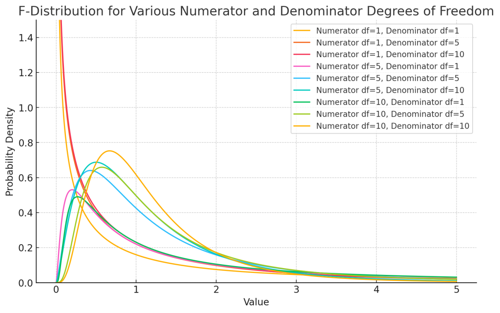 여기서 각 카이제곱 변수는 독립적이며, 각각의 분모는 해당 변수의 자유도로 나눠진 카이제곱 분포의 값을 사용한다. - 주로 분산분석(ANOVA)에서 여러 그룹 간의 평균 차이가 통계적으로 유의한지를 검정하는 데 사용된다.
