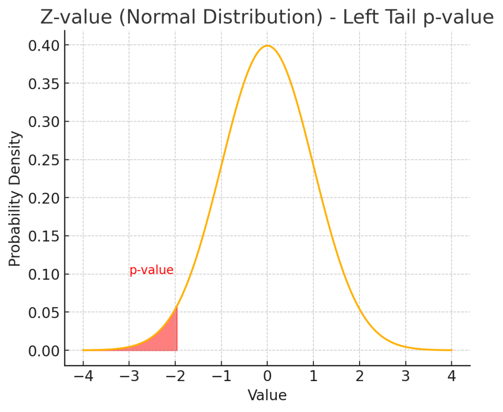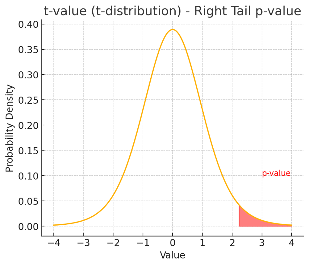 - 정의: 표준 정규 분포를 따르는 변수 $Z$와 자유도 $df$를 갖는 카이제곱 분포를 따르는 독립 변수 (V)에 대해, t-값은 다음과 같이 정의된다.