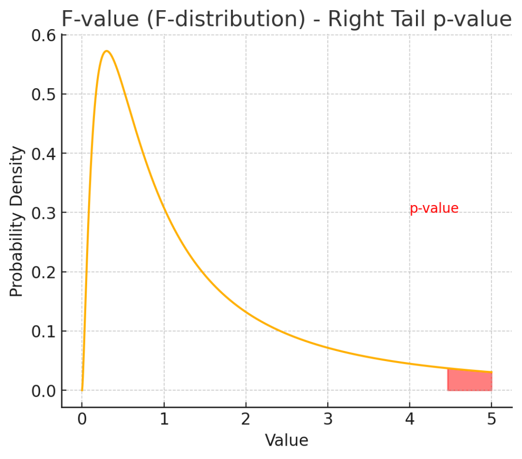 - 정의: 자유도가 $df_1$인 카이제곱 분포 $V_1$과 자유도가 $df_2$인 카이제곱 분포 $V_2$를 독립적으로 갖는 두 변수에 대해, F-값은 다음과 같이 정의된다.