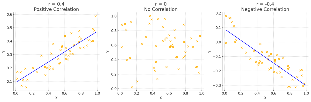 위에서는 상관계수 (r = 0.4), (r = 0), (r = -0.4)에 대한 예시를 보여주며, 각각 양의 상관관계, 무상관, 음의 상관관계를 나타내고 있다.