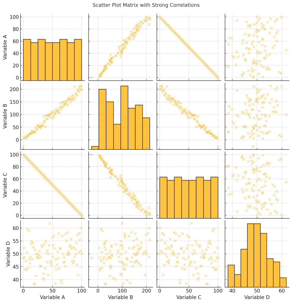 - 산점도 행렬: 위의 산점도 행렬은 각 변수 간의 명확한 상관관계를 보여준다. “Variable A”와 “Variable B”는 양의 상관관계를, “Variable C”와 “Variable D”는 음의 상관관계를 나타낸다.