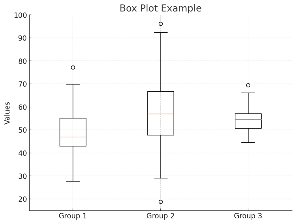 - 상자그림: 위의 상자 그림(Box Plot)은 세 그룹의 데이터 분포를 시각적으로 나타낸 것이다. 상자 내의 선은 중앙값을 나타내고, 상자의 상단과 하단은 1사분위수(Q1)와 3사분위수(Q3)를 나타낸다. 수염(whisker)은 데이터 범위를, 이상치(outlier)는 상자의 밖에 위치한 점으로 표현된다.