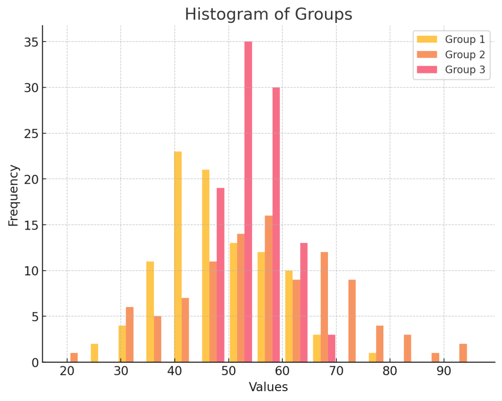 - 히스토그램: 히스토그램은 세 그룹의 데이터 분포를 시각적으로 보여준다. 각 그룹의 데이터가 서로 어떻게 겹치는지, 그리고 각 데이터의 빈도 분포를 쉽게 비교할 수 있다.