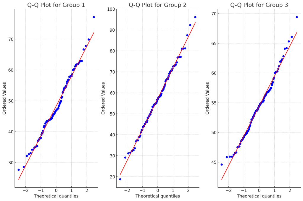 - 정규확률도: 위의 Q-Q(정규확률도) 그래프는 각 그룹의 데이터가 정규분포와 얼마나 가까운지를 시각적으로 나타낸 것이다. 데이터가 직선에 가까울수록 해당 그룹의 데이터가 정규분포에 더 가깝다는 것을 의미한다