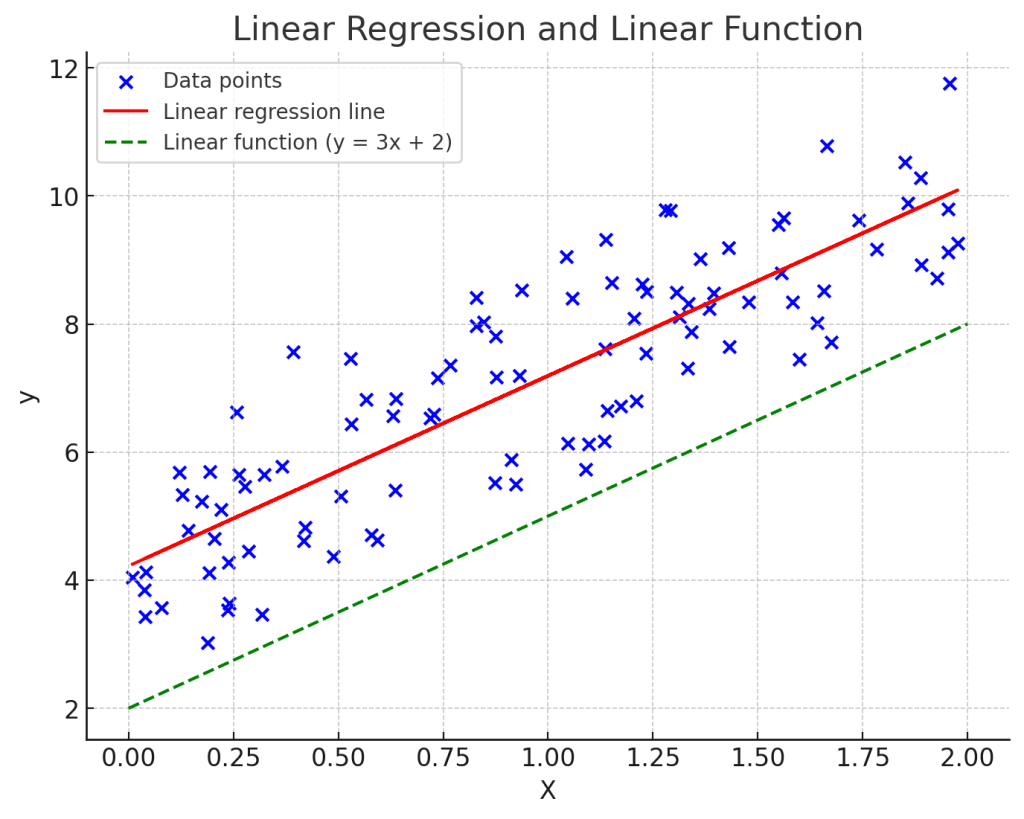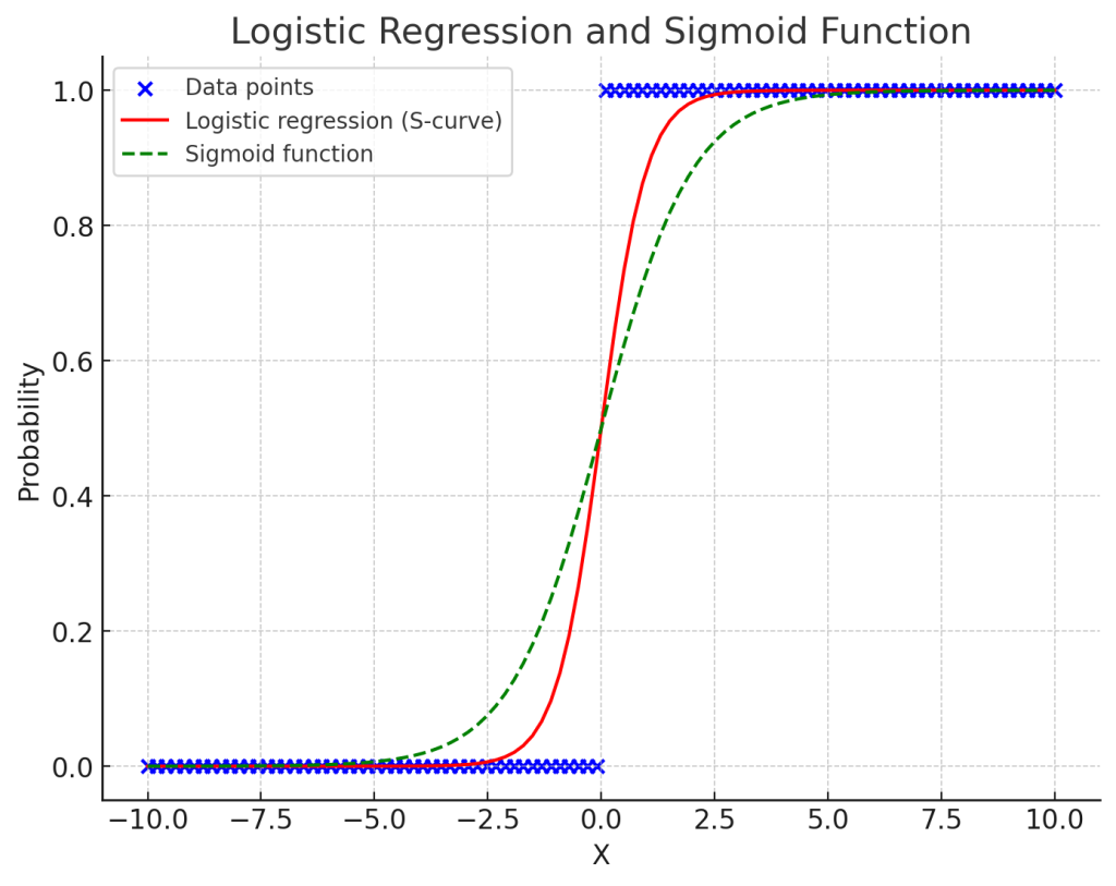 위 그래프에서 파란 점들은 이진 데이터 포인트를 나타내며, 빨간 선은 로지스틱 회귀 모델에서 예측된 확률을 나타내는 S자 곡선이다. 초록색 점선은 수학적 시그모이드 함수를 나타낸다