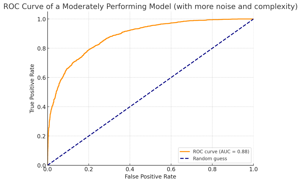 위 그래프는 성능이 적당한 모델의 ROC 곡선을 보여준다. AUC 스코어가 1에 가깝지는 않지만, 무작위 추측보다 성능이 좋은 모델이다. 곡선이 대각선보다 위에 있지만 완벽하지 않다는 점에서, 모델이 어느 정도의 예측력을 가지고 있으나 오류도 포함하고 있음을 알 수 있다. AUC 스코어는 0.7에서 0.85 사이에 위치해 성능이 보통 이상이다.