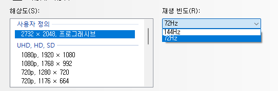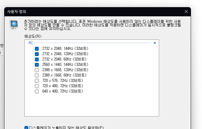 두번째는 본인이 추가할 해상도에 본인의 모니터 주사율에 딱맞는 것과, 본인이 원격으로 사용할 주사율 총 2개의 해상도를 만들어야 한다.