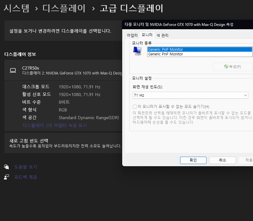 나는 1070MAX-Q 노트북과 삼성 쓰레기 모니터 1920×1080 72hz 짜리를 사용할 것이다. 노트북 디스플레이는 1920×1080 144hz다.